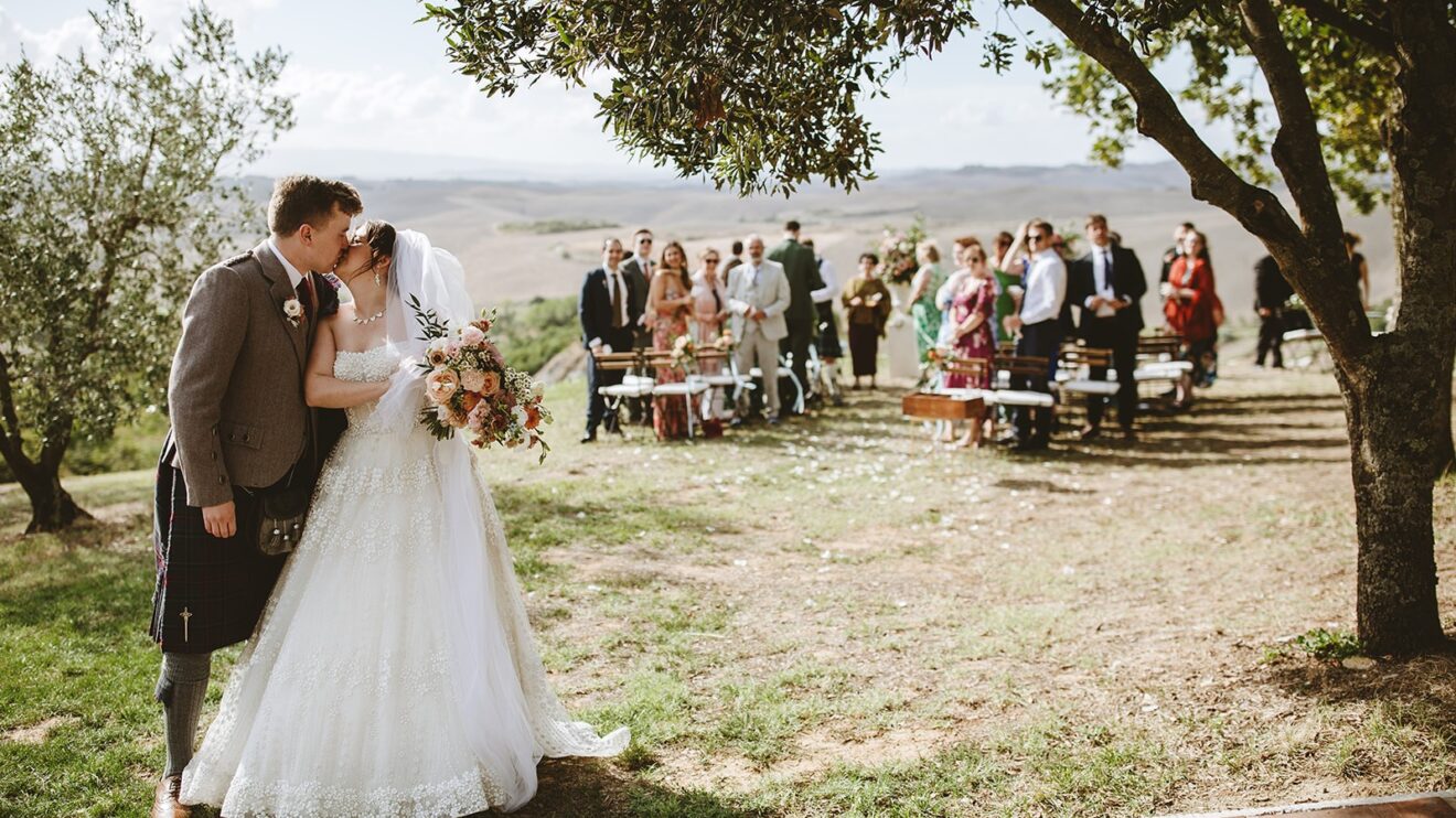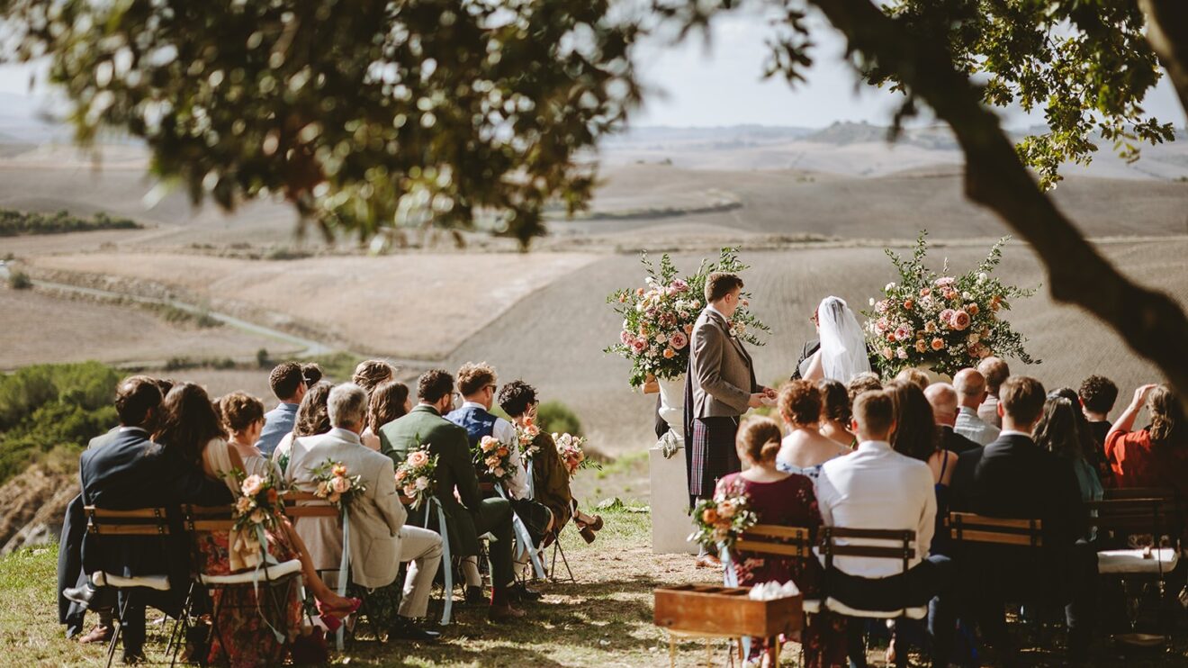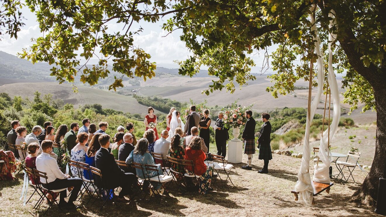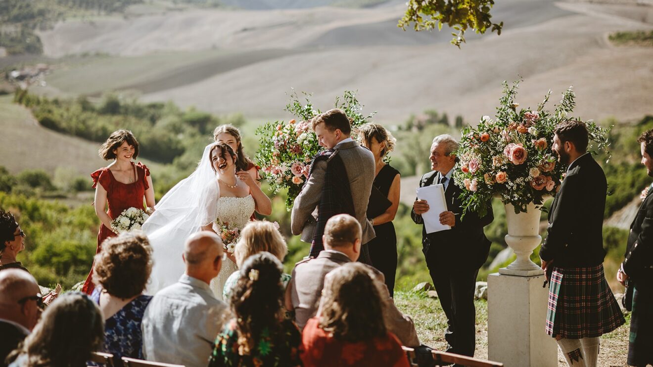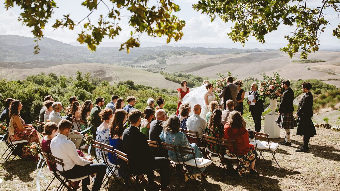 Emma and David said their vows overlooking the rolling fields of Volterra and enjoyed their aperitivo to the sounds of #italygypsyband