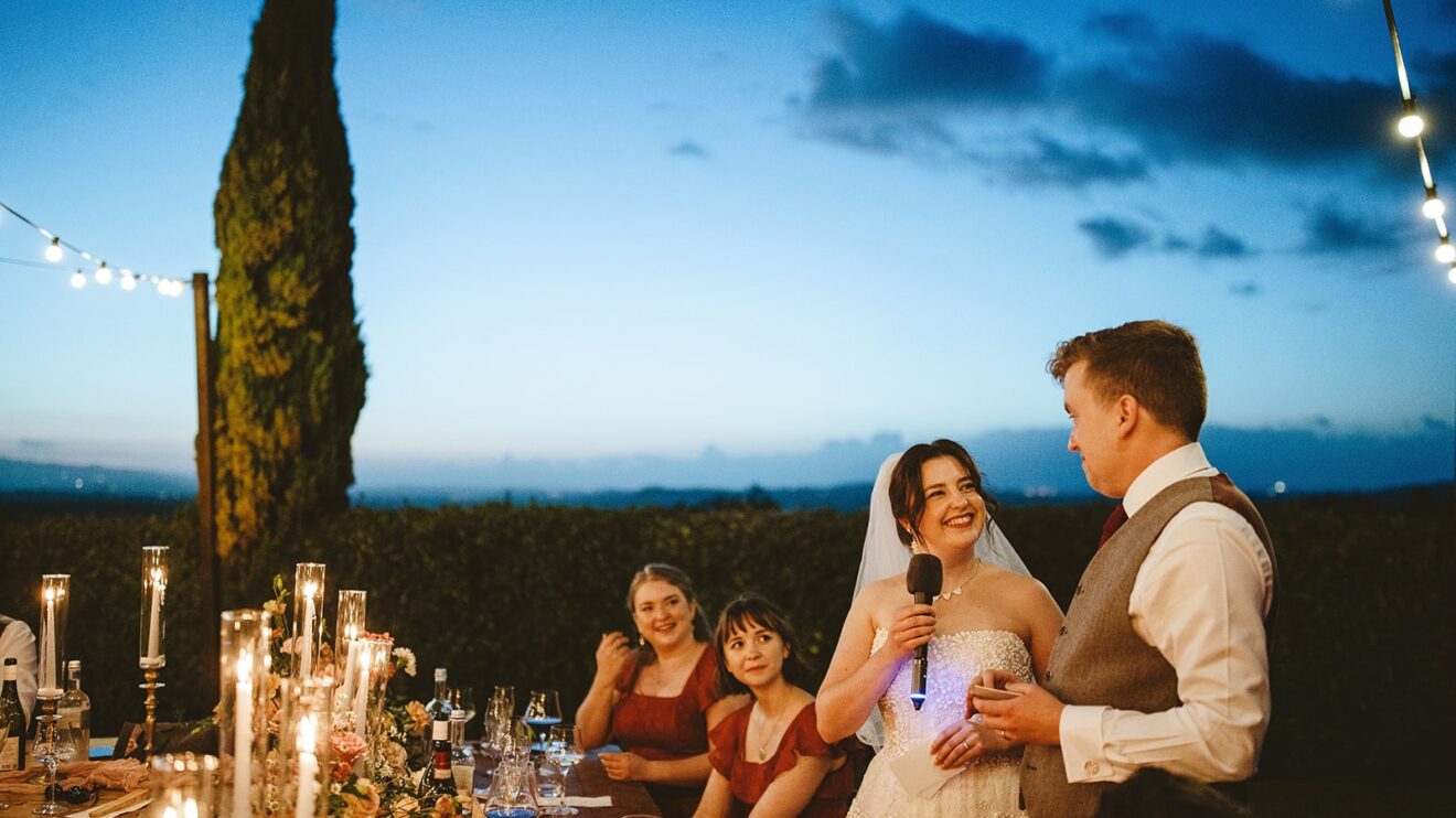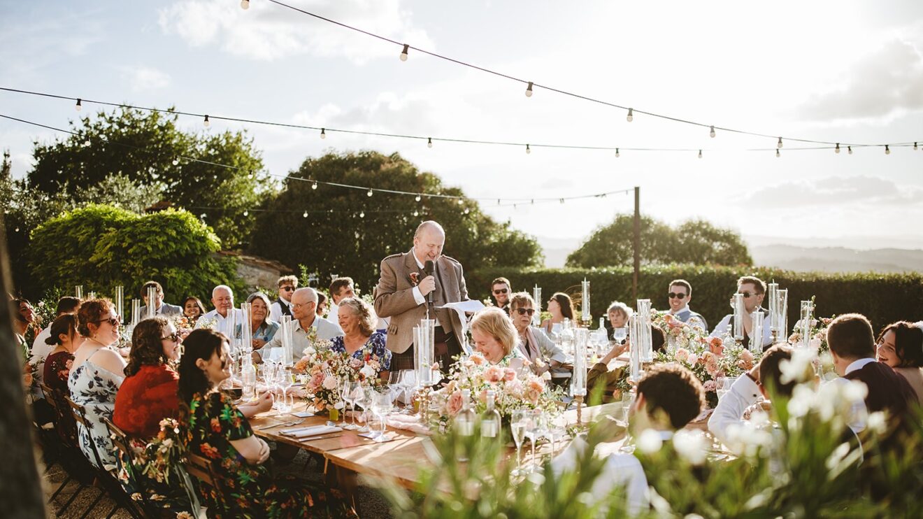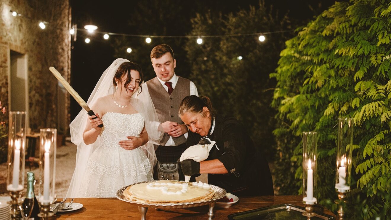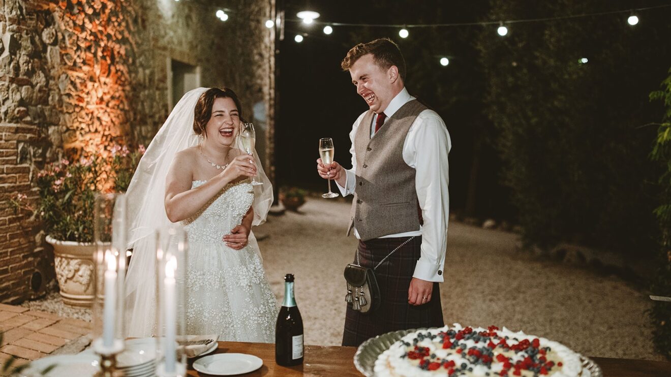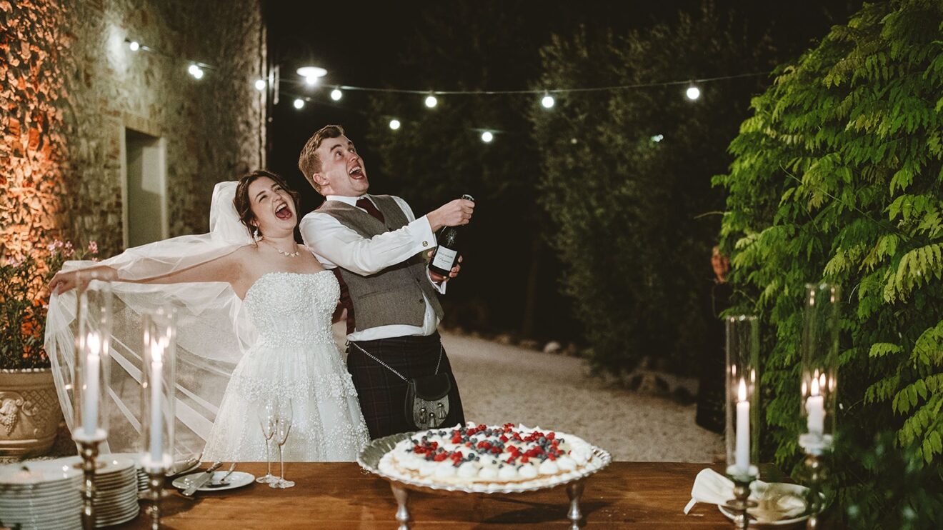 They had a beautiful set up in the villa gardens for the homecooked dinner by the family catering team. Followed by an amazing traditional cake cutting where the couple helped to put their millefoglie cake together and then fun and dancing by the pool from their Ceilidh band. The guests had great fun dancing and then surprise fireworks lit the night up. 🎉