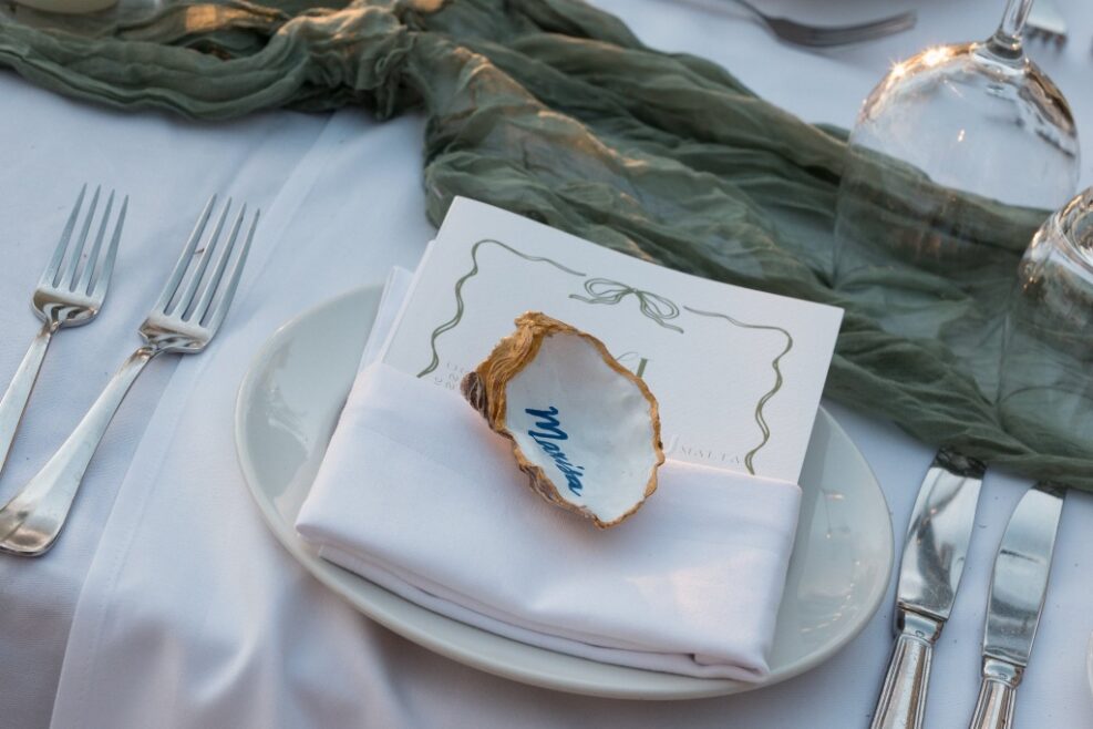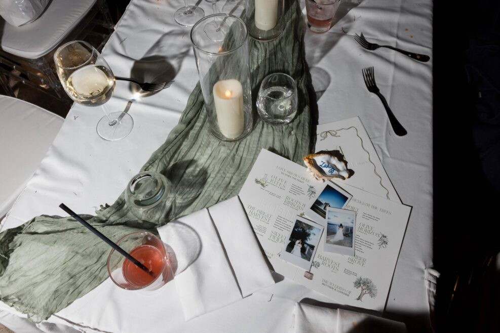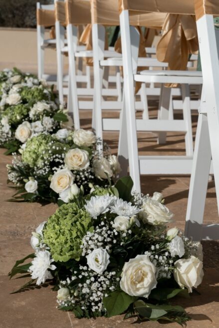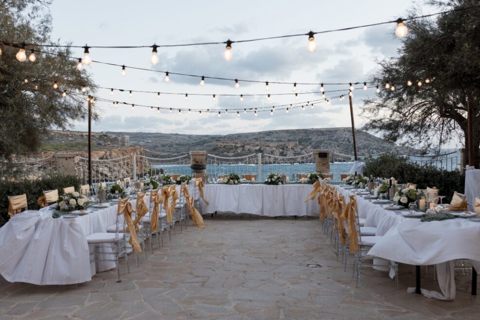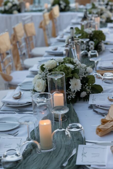 The tables were set out in Caterpillar style, which looked truly amazing. Both myself and the venue had never worked with this style before. The idea was given by florist who also helped with the set up and adding of the beautiful centrepieces between the links of the caterpillar and the candles and shells creating “the way”. The festoon lights created a magical ambience above the caterpillar tables set up.