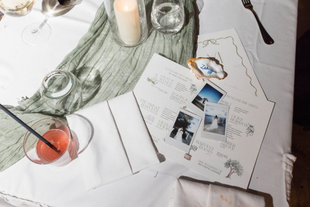Guests entered the terrace to see a welcome sign decorated with luggage tags for the table plan set on a big backdrop including photos of the couples special moments. Festoon lights also created a magical ambience above the terrace in the evening.
